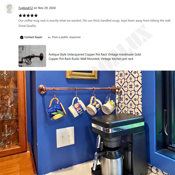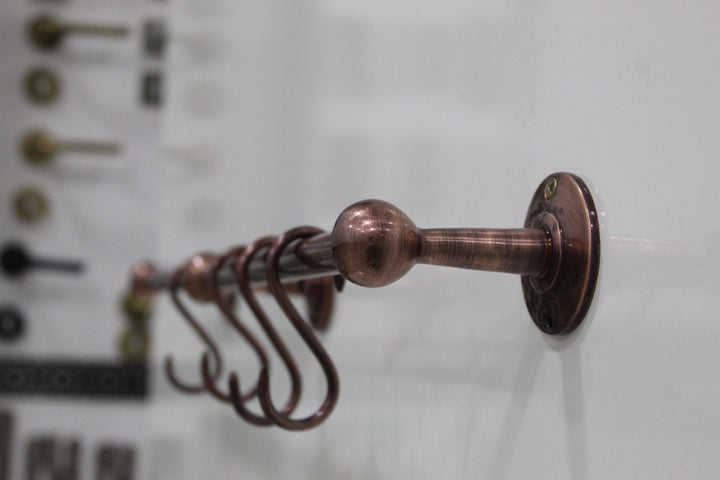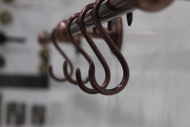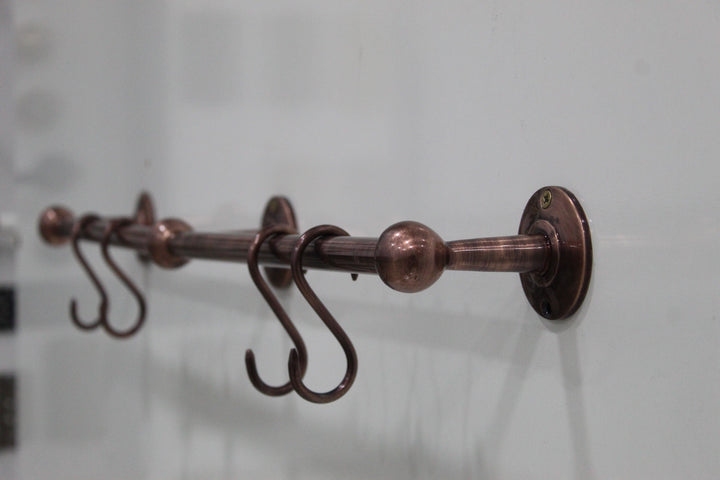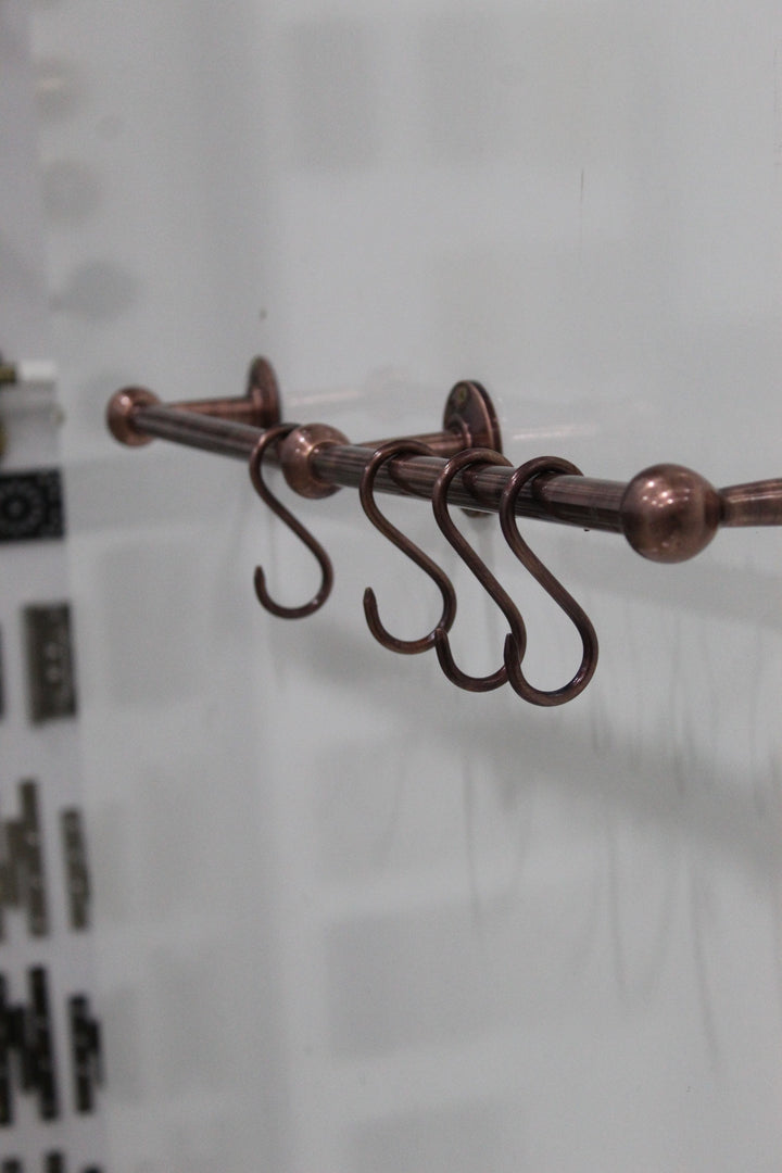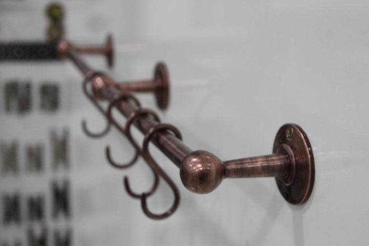 Discover the elegance of historical craftsmanship with our Antique Style Unlacquered Copper Pot Rack. This vintage, handmade pot rack is meticulously crafted from gold-hued copper, promising both beauty and durability. Designed with a rustic aesthetic, it merges functionality with timeless design, perfect for any kitchen loving an antique or farmhouse ambiance. The wall-mounted rack is engineered for strength, ensuring your cookware is securely displayed. As an unlacquered piece, it develops a unique patina over time, enhancing its antique charm. Elevate your kitchen with this expertly crafted, vintage copper pot rack, and enjoy a blend of tradition and practicality.