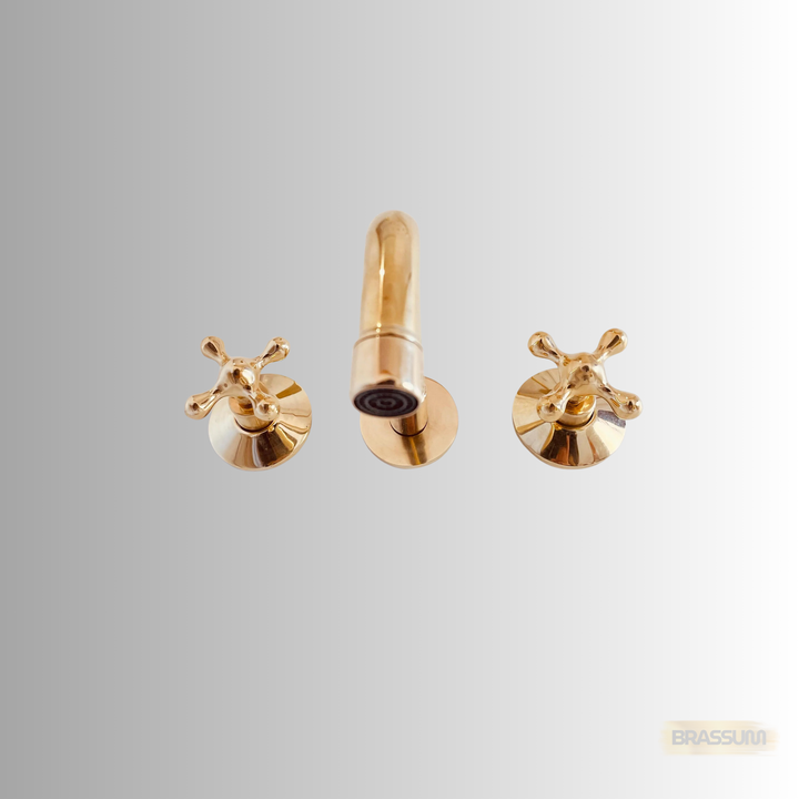 Handmade wall-mount faucet crafted from 100% solid unlacquered brass. Classic cross handles and a timeless spout create a premium, long-lasting fixture for bathrooms, powder rooms, or kitchens. The warm brass surface naturally develops a rich patina with use, giving each piece a unique character.