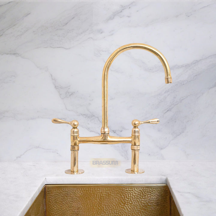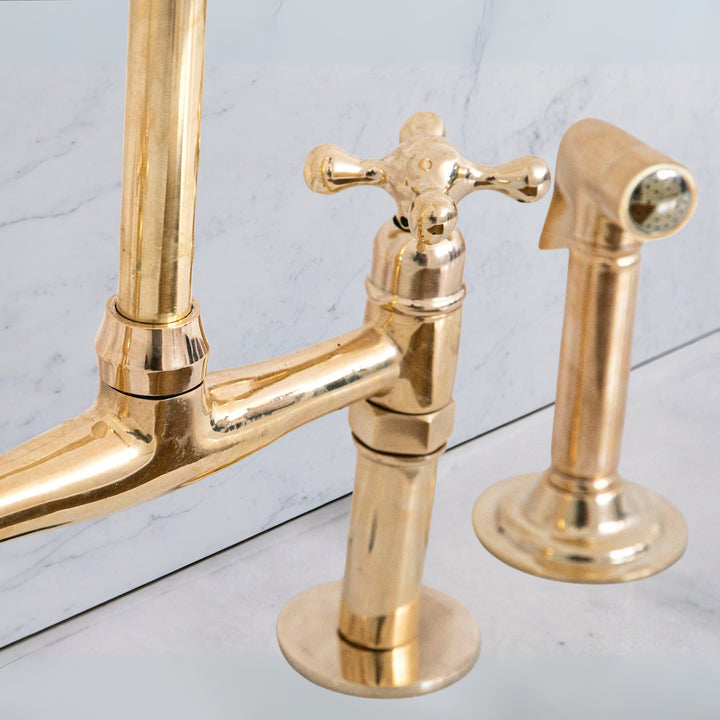 Handcrafted from 100% solid unlacquered brass, this bridge faucet set delivers warm golden tones and a natural finish that develops a unique patina with daily use. Perfect for farmhouse, classic, or modern kitchens, the set includes the bridge mixer, dual handles, and a matching side sprayer for convenient rinsing.