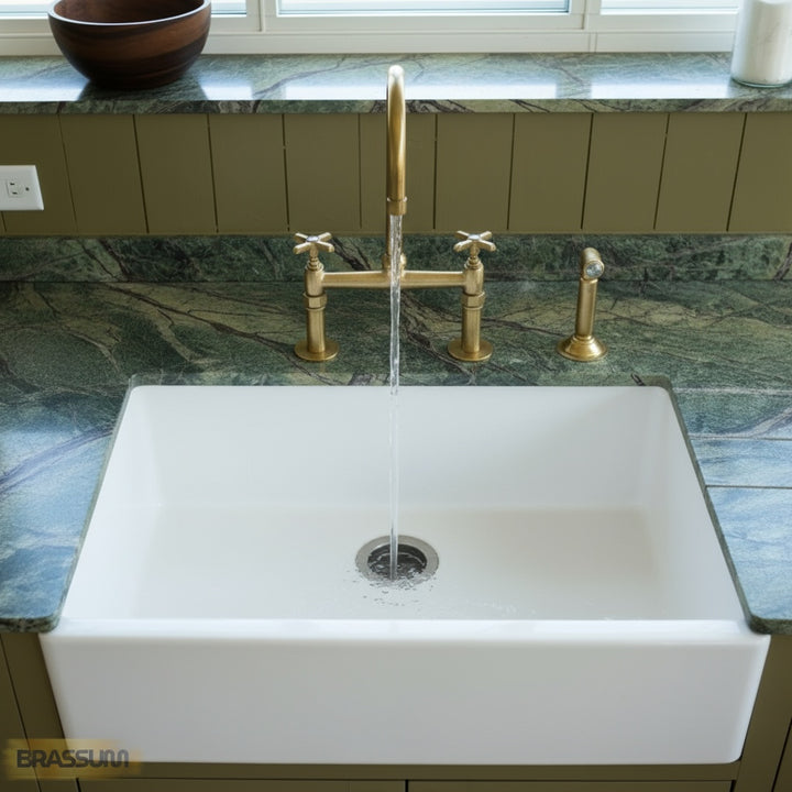 Handcrafted from solid unlacquered brass, this bridge faucet develops a natural patina over time for a warm, lived-in look. The high gooseneck spout clears large pots, dual cross handles give precise control, and the matching side spray makes rinsing and cleanup easy. Ideal for farmhouse, transitional, and modern kitchens.